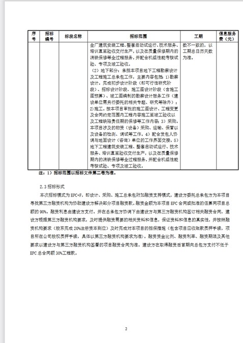 本次招標(biāo)模式為EPC+F,即設(shè)計(jì)、采購(gòu)、施工總承包附加融資支持模式,建設(shè)方委托總承包方為本項(xiàng)目尋找第三方融資機(jī)構(gòu)為協(xié)助建設(shè)方解決部分項(xiàng)目融資款。