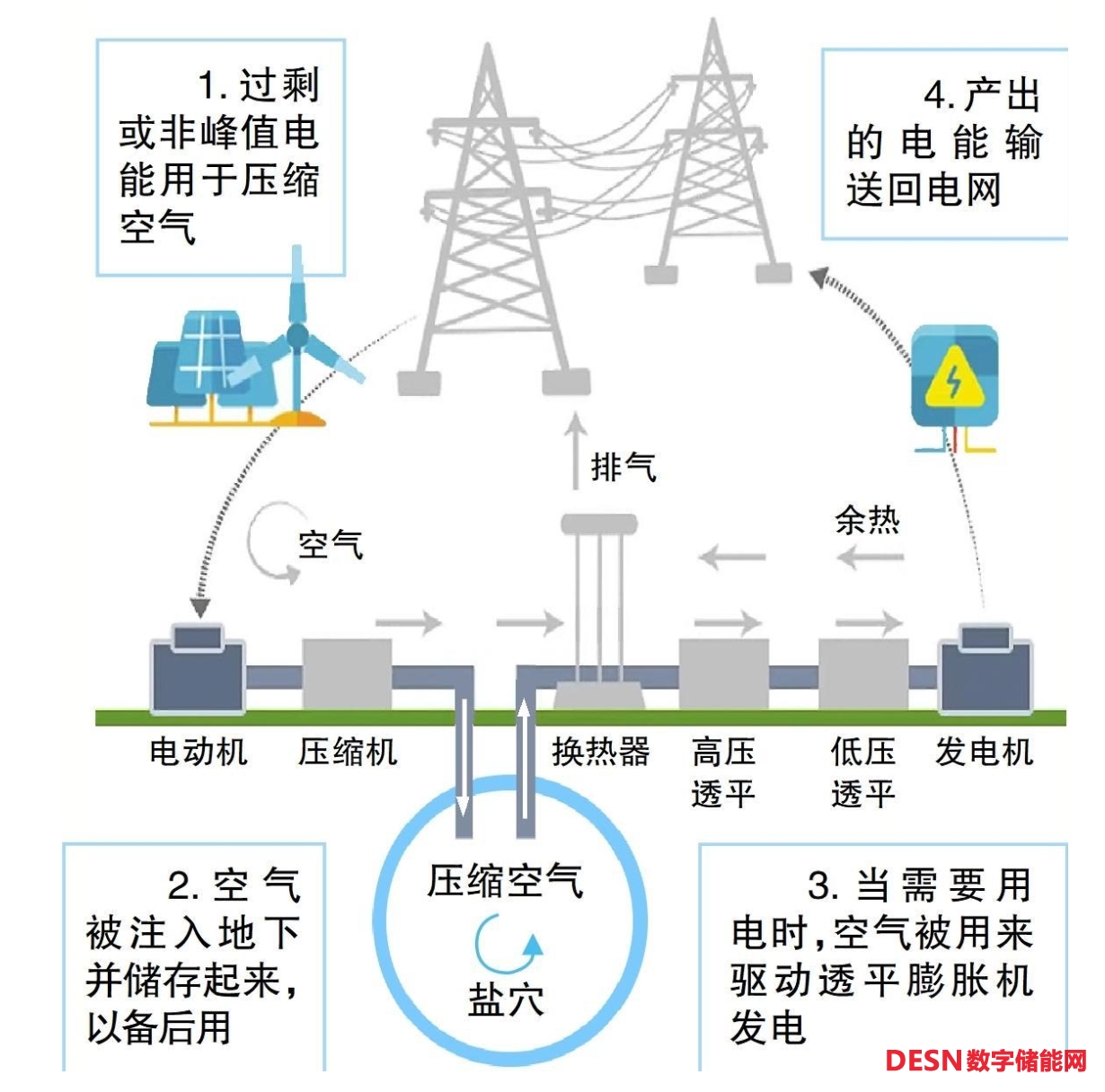 壓縮空氣儲(chǔ)能電站在用電低谷時(shí)充電,電動(dòng)機(jī)驅(qū)動(dòng)壓縮機(jī)把空氣高壓密封并存儲(chǔ)起來;在用電高峰時(shí)放電,將儲(chǔ)存的高壓空氣釋放出來,驅(qū)動(dòng)透平膨脹機(jī)組發(fā)電,再通過電網(wǎng)輸送到千家萬(wàn)戶。