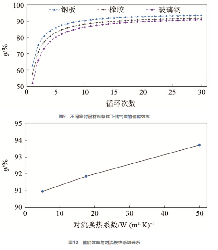 圖9給出了漏氣率為3.0 kg/s條件下儲(chǔ)氣庫(kù)的儲(chǔ)能效率變化規(guī)律。由圖可知,盡管密封材料類型不同, 但其儲(chǔ)能效率的隨充放氣循環(huán)次數(shù)變化而變化的規(guī)律基本相同。采用鋼板作為密封層時(shí)的儲(chǔ)能效率最高,采用玻璃鋼作為密封層的儲(chǔ)能效率最低。經(jīng)過(guò)30個(gè)充放氣循環(huán)后,密封層材料為鋼板時(shí)的儲(chǔ)能效率為93.71%;密封層材料為玻璃鋼時(shí),其儲(chǔ)能效率為90.96%。圖10表明儲(chǔ)能效率隨著密封層與壓縮空氣間對(duì)流換熱系數(shù)的增加而加大,其原因是對(duì)流傳熱系數(shù)越大,壓縮空氣中的熱量通過(guò)密封層傳遞到圍巖中的熱量越多,壓縮空氣溫度越低,達(dá)到相同壓力所需的空氣質(zhì)量越大。由于儲(chǔ)氣庫(kù)內(nèi)的?值大小主要取決于空氣質(zhì)量的大小,因此,儲(chǔ)氣庫(kù)的儲(chǔ)能效率越高。