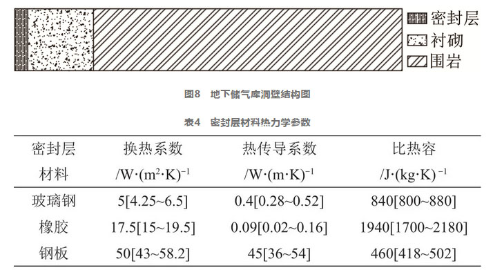 硬巖洞穴地下儲(chǔ)氣庫(kù)一般需要設(shè)置密封層以保證高壓氣體能被有效封存,一般情況下密封結(jié)構(gòu)結(jié)構(gòu)型式及組成如圖8所示。常用的密封層材料有鋼材、橡膠和玻璃鋼等。早期的密封層都是采用鋼板制作,成本較高。近年來(lái),許多研究者都在嘗試用高分子材料替代鋼板作為密封層。其中,文獻(xiàn)的研究表明,橡膠和玻璃鋼等高分子材料滿足氣密和力學(xué)要求,可以作為壓氣儲(chǔ)能地下儲(chǔ)氣庫(kù)的密封層材料使用。密封層材料類型不同,其換熱性能和傳熱性能也不相同。表4為3種常用密封層材料的熱力學(xué)參數(shù)值。