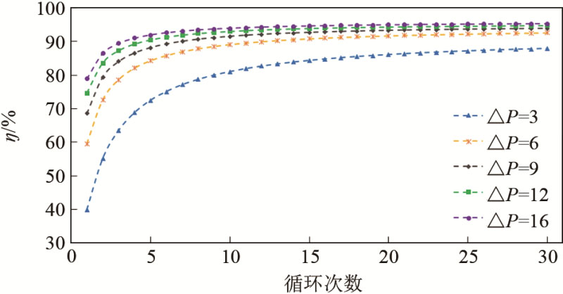 圖7給出了第30個(gè)循環(huán)儲(chǔ)氣庫(kù)儲(chǔ)能效率與運(yùn)行壓力差(△P)的關(guān)系圖。儲(chǔ)氣庫(kù)儲(chǔ)能效率隨△P的增大呈現(xiàn)出非線性增加的特點(diǎn),且增加趨勢(shì)逐漸趨于平緩。這表明當(dāng)運(yùn)行壓力差達(dá)到一定數(shù)值后,提高運(yùn)行壓力差對(duì)儲(chǔ)能效率的提高作用有限。