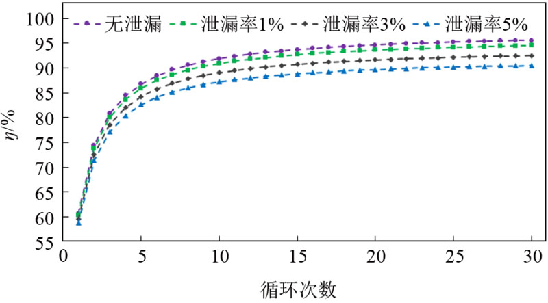 (2)氣體泄漏對(duì)地下儲(chǔ)氣庫(kù)儲(chǔ)能效率的影響較大,結(jié)果表明在一個(gè)運(yùn)行周期內(nèi),儲(chǔ)能效率隨泄漏率的增大而減少;在不同泄漏條件下,儲(chǔ)氣庫(kù)儲(chǔ)能效率隨充放氣循環(huán)次數(shù)的增加均逐漸上升,上升趨勢(shì)在后期趨于平緩。