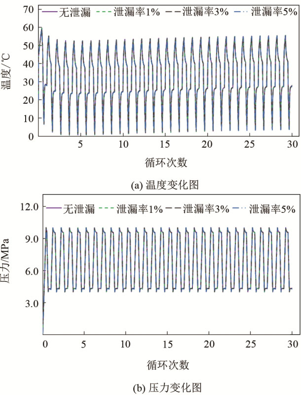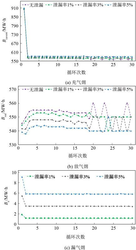 由圖3(b)可以看出,在保持儲(chǔ)氣庫(kù)最高和最低運(yùn)行壓力不變的30個(gè)充放氣循環(huán)中泄漏率對(duì)壓縮空氣的壓力變化過(guò)程影響不大。