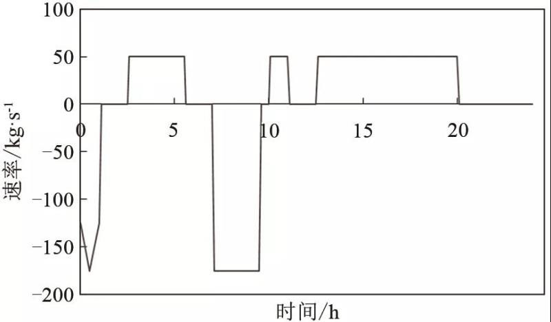 Huntorf 電站在一個(gè)運(yùn)行周期內(nèi)的充放氣速率如圖1所示,三次注入的空氣溫度分別為50.96 ℃、45.95 ℃和49.08 ℃。另外,為了簡(jiǎn)化計(jì)算,第一個(gè)小時(shí)的放氣速率取平均值-150 kg/s。