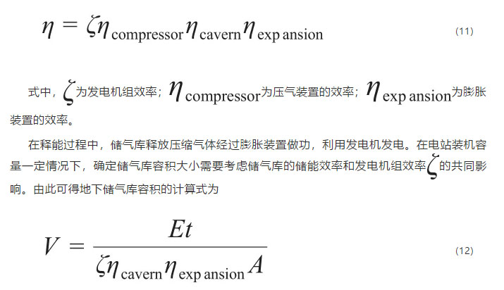 為保證發(fā)電機(jī)組能達(dá)到設(shè)計(jì)所需的裝機(jī)容量,地下儲(chǔ)氣庫(kù)需要能提供足夠的可供做功發(fā)電的?值。?值的大小主要與儲(chǔ)氣量的多少有關(guān)。在機(jī)組設(shè)備和運(yùn)行方式一定的情況下,儲(chǔ)氣量的多少取決于儲(chǔ)氣庫(kù)容積的大小,因此合理擬定儲(chǔ)氣庫(kù)容的容積是壓氣儲(chǔ)能電站設(shè)計(jì)的關(guān)鍵任務(wù)之一。