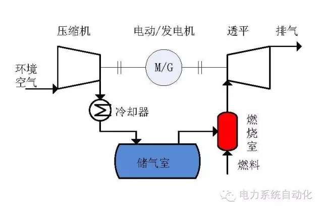 壓縮空氣儲能系統(tǒng)可利用低谷電、棄風(fēng)電、棄光電等對空氣進(jìn)行壓縮,并將高壓空氣密封在地下鹽穴、地下礦洞、過期油氣井或新建儲氣室中,在電網(wǎng)負(fù)荷高峰期釋放壓縮空氣推動(dòng)透平機(jī)(氣輪機(jī)、渦輪機(jī)等)發(fā)電。按照運(yùn)行原理,壓縮空氣儲能系統(tǒng)可以分為補(bǔ)燃式和非補(bǔ)燃式兩類。