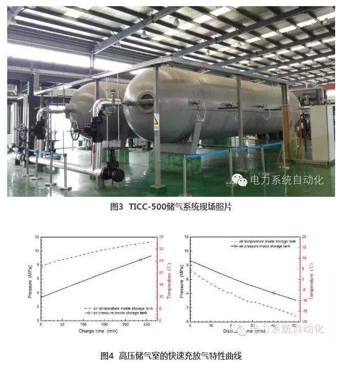 儲(chǔ)氣子系統(tǒng)是用來存儲(chǔ)壓縮機(jī)所產(chǎn)生的高壓空氣,實(shí)現(xiàn)分子內(nèi)勢能的存儲(chǔ)。其主要由儲(chǔ)氣罐、管道、閥門等組成。壓縮空氣儲(chǔ)能采用空氣作為儲(chǔ)能介質(zhì),儲(chǔ)氣系統(tǒng)具有容量大、壓力高等特點(diǎn)。TICC-500采用高壓鋼制壓力容器作為儲(chǔ)氣室,建設(shè)了兩臺(tái)總?cè)莘e為100立方米的10MPa高壓儲(chǔ)氣罐(如圖3所示),并完成了大容量高壓儲(chǔ)氣室的快速充放氣特性研究(如圖4所示)。