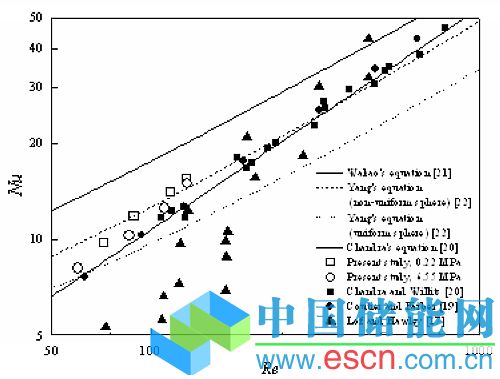 圖2 空氣-填充床平均傳熱Nu隨Re變化