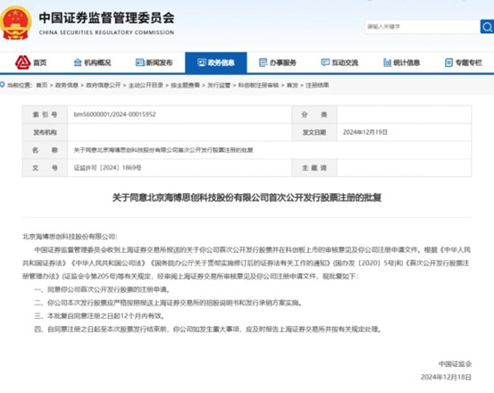 中國儲能網(wǎng)訊:2024年12月19日中國證券監(jiān)督管理委員會官網(wǎng)正式更新了《關(guān)于同意北京海博思創(chuàng)科技股份有限公司首次公開發(fā)行股票注冊的批復》文件。這一批準意味著,經(jīng)過長達548天的精心籌備與不懈努力,北京海博思創(chuàng)科技股份有限公司的上市之旅終于越過了最為關(guān)鍵的一道障礙。接下來,公司只需提交最后的申請以獲取正式批文,隨后便將迎來激動人心的敲鐘上市時刻。