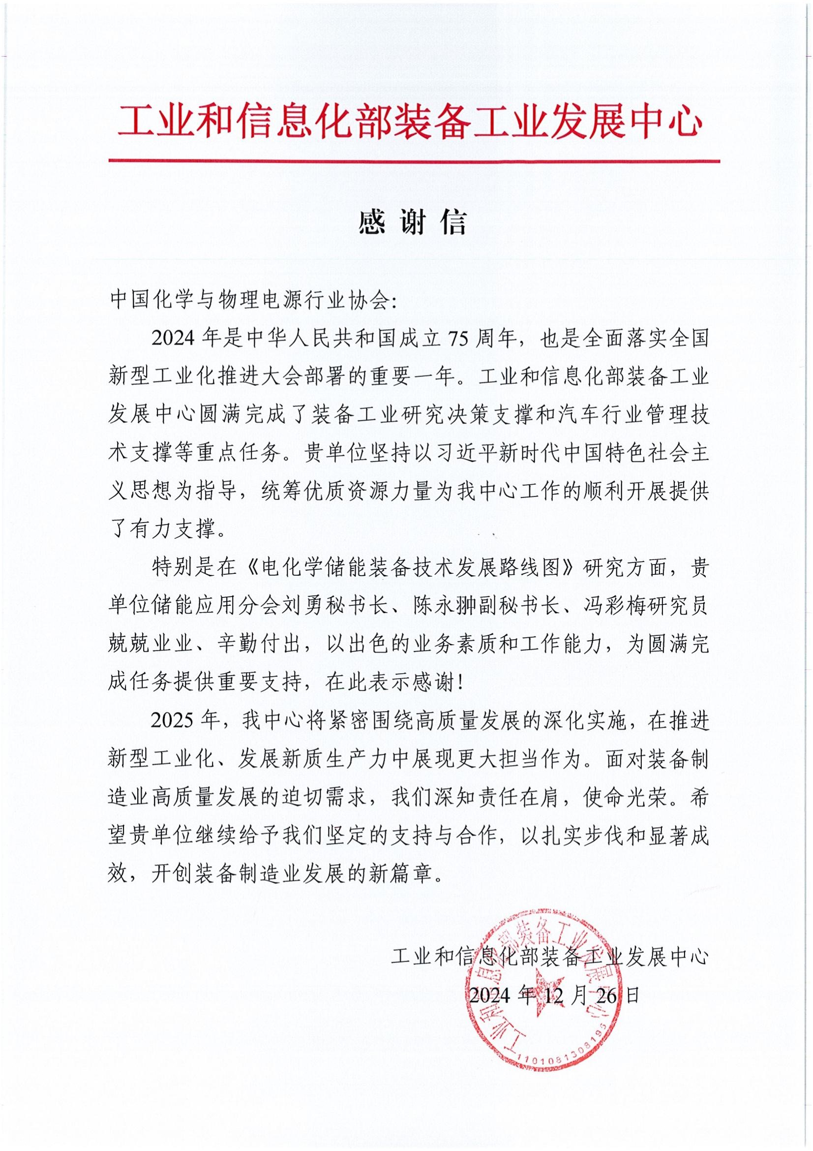 感謝信強調,2024 年是中華人民共和國成立75周年,也是全面落實全國新型工業(yè)化推進大會部署的重要一年。工業(yè)和信息化部裝備工業(yè)發(fā)展中心圓滿完成了裝備工業(yè)研究決策支撐和汽車行業(yè)管理技術支撐等重點任務。中國化學與物理電源行業(yè)協(xié)會堅持以習近平新時代中國特色社會主義思想為指導,統(tǒng)籌優(yōu)質資源力量為該中心工作的順利開展提供了有力支撐。