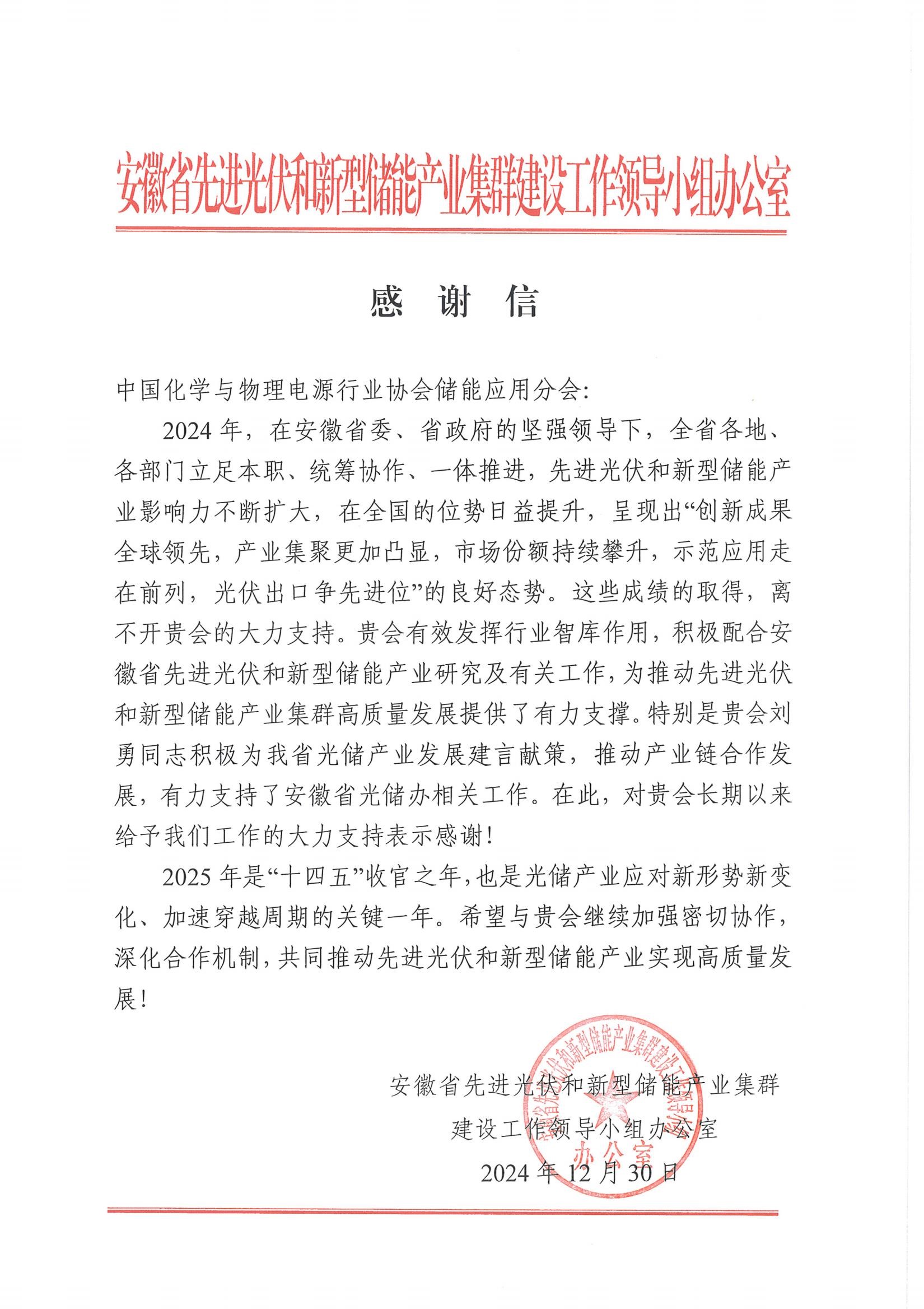 中國(guó)儲(chǔ)能網(wǎng)訊:12月30日,安徽省先進(jìn)光伏和新型儲(chǔ)能產(chǎn)業(yè)集群建設(shè)工作領(lǐng)導(dǎo)小組辦公室向我會(huì)致感謝信。