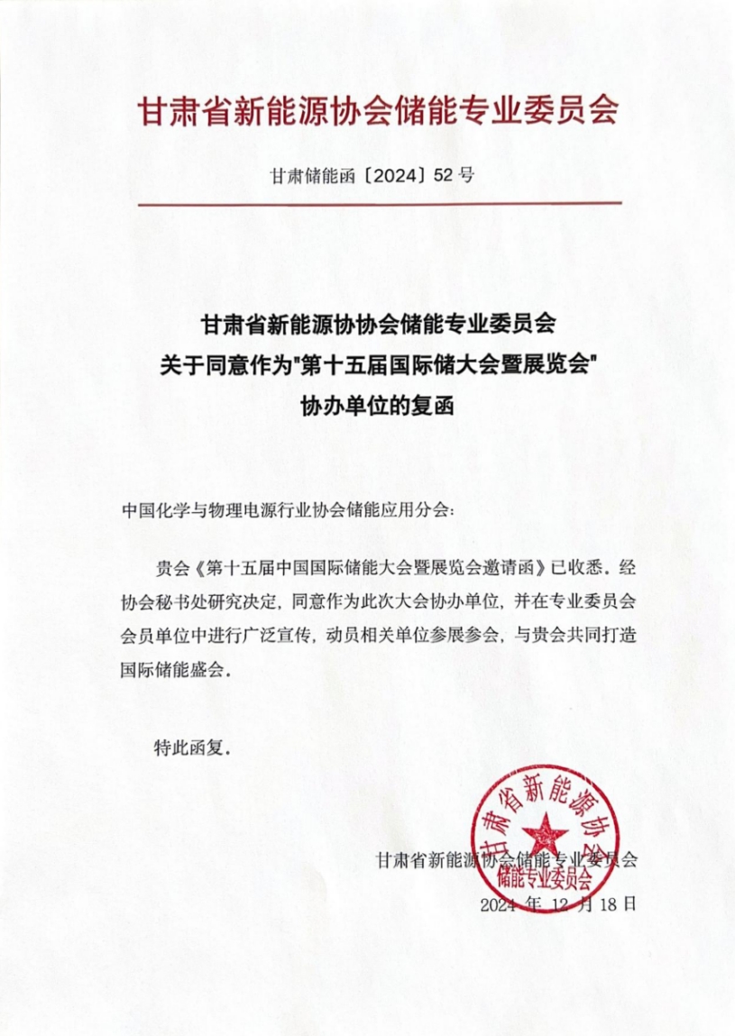 中國儲能網(wǎng)訊:近日,甘肅省新能源協(xié)會儲能專業(yè)委員會復(fù)函中國化學(xué)與物理電源行業(yè)協(xié)會儲能應(yīng)用分會,同意作為第十五屆中國國際儲能大會暨展覽會(CIES2025)協(xié)辦單位,并在專業(yè)委員會員單位中進行廣泛宣傳,動員相關(guān)單位參展參會,與中國化學(xué)與物理電源行業(yè)協(xié)會儲能應(yīng)用分會共同打造這場國際儲能盛會。