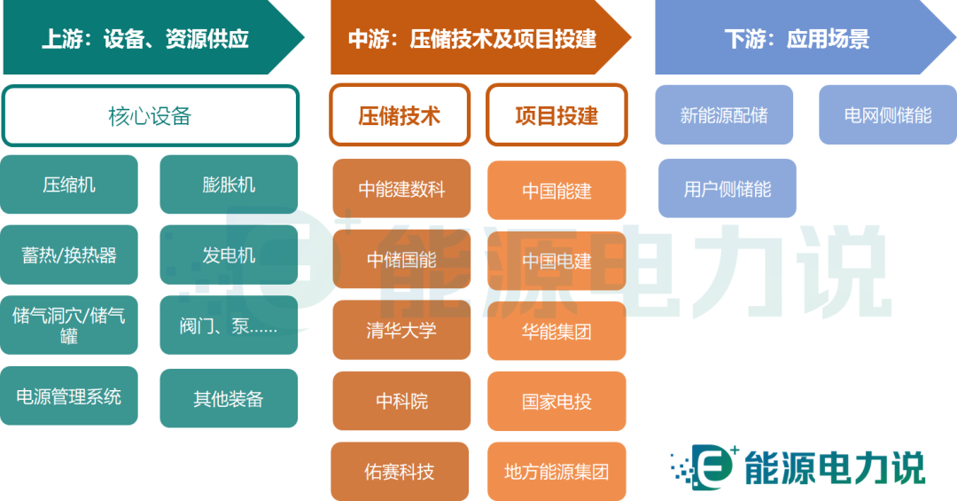 中游為壓儲技術(shù)提供及項目投建,其中儲能技術(shù)的研發(fā)與應(yīng)用參會企業(yè)有中能建數(shù)、中儲國能、中科院、清華大學、佑賽科技等;項目投建方則包括中國能建、中國電建、五大發(fā)電集團、地方能源集團等。