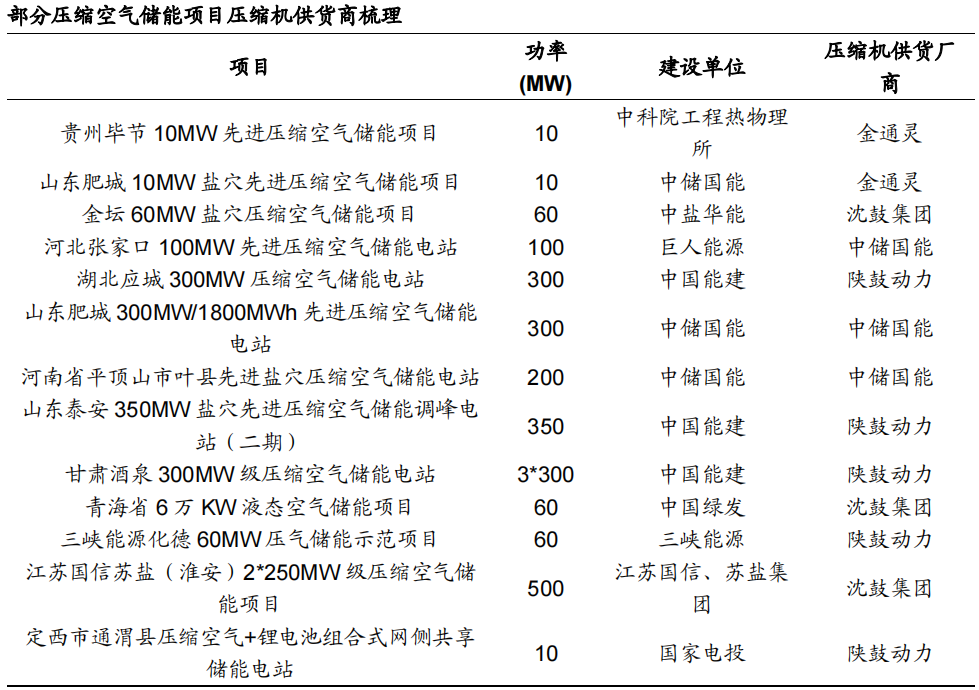 上游為設(shè)備、資源供應(yīng),壓縮空氣儲能關(guān)鍵設(shè)備包括壓縮機、膨脹機、儲熱器、換熱器、系統(tǒng)集成與控制設(shè)備等。核心設(shè)備廠家有陜鼓動力、沈鼓集團、哈爾濱電氣、東方電氣、金通靈、杭氧股份、川空集團等。