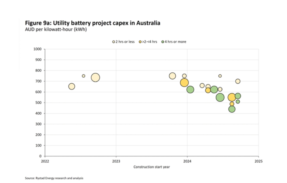 Rystad Energy公司在報(bào)告指出,自從2023年8月以來,電池儲(chǔ)能項(xiàng)目資本支出在12個(gè)月內(nèi)下降了33%。2024年部署的電池儲(chǔ)能項(xiàng)目資本支出將在450澳元/kWh至600澳元/kWh之間,這與澳大利亞國家科學(xué)機(jī)構(gòu)估計(jì)的423澳元/kWh相符。
