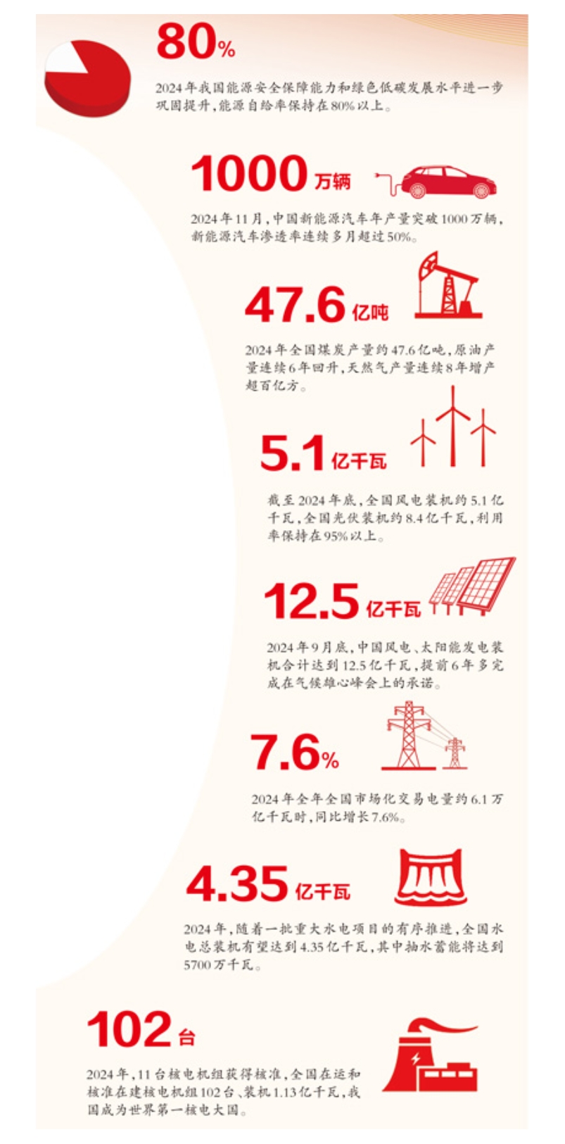 截至2024年9月底,我國(guó)風(fēng)電、太陽(yáng)能發(fā)電裝機(jī)合計(jì)達(dá)到12.5億千瓦,提前6年多完成在氣候雄心峰會(huì)上的承諾;全國(guó)新能源汽車年產(chǎn)量突破1000萬(wàn)輛,新能源汽車滲透率連續(xù)多月超過50%;我國(guó)建成全球最大、最完整的新能源產(chǎn)業(yè)鏈,能源行業(yè)含“綠”量更高。