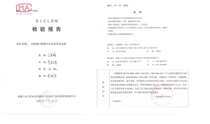 權(quán)威CMA第三方檢驗(yàn)報(bào)告表明:依據(jù)國標(biāo)歷時(shí)近3個(gè)月的檢驗(yàn)時(shí)間內(nèi),中儲(chǔ)國能山東肥城的300MW先進(jìn)壓縮空氣儲(chǔ)能系統(tǒng)核心設(shè)備開展了包括耐壓試驗(yàn)、空載特性、電機(jī)效率在內(nèi)的十余項(xiàng)型式試驗(yàn),設(shè)備性能表現(xiàn)卓越。