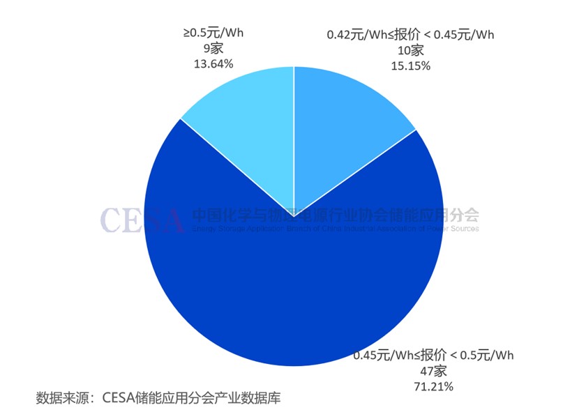 可以看出,僅9家企業(yè)報價在0.5元/Wh以上,86.36%的企業(yè)報價低于0.5元/Wh,15.15%的企業(yè)投標(biāo)報價低于0.45元/Wh,71.21%的企業(yè)報價集中在0.45-0.5元/Wh這個區(qū)間內(nèi)。