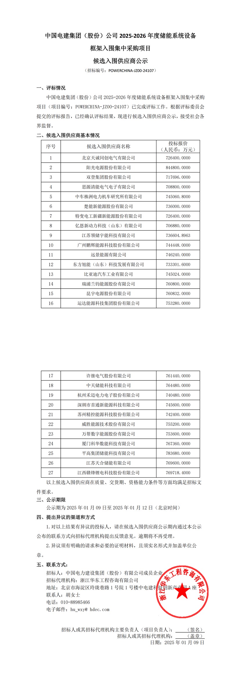 中國儲能網(wǎng)訊:1月9日,中國電建集團(股份)公司2025-2026年度儲能系統(tǒng)設(shè)備框架入圍集中采購項目候選入圍供應商公示。