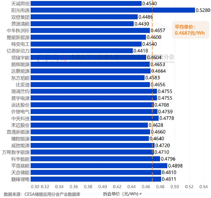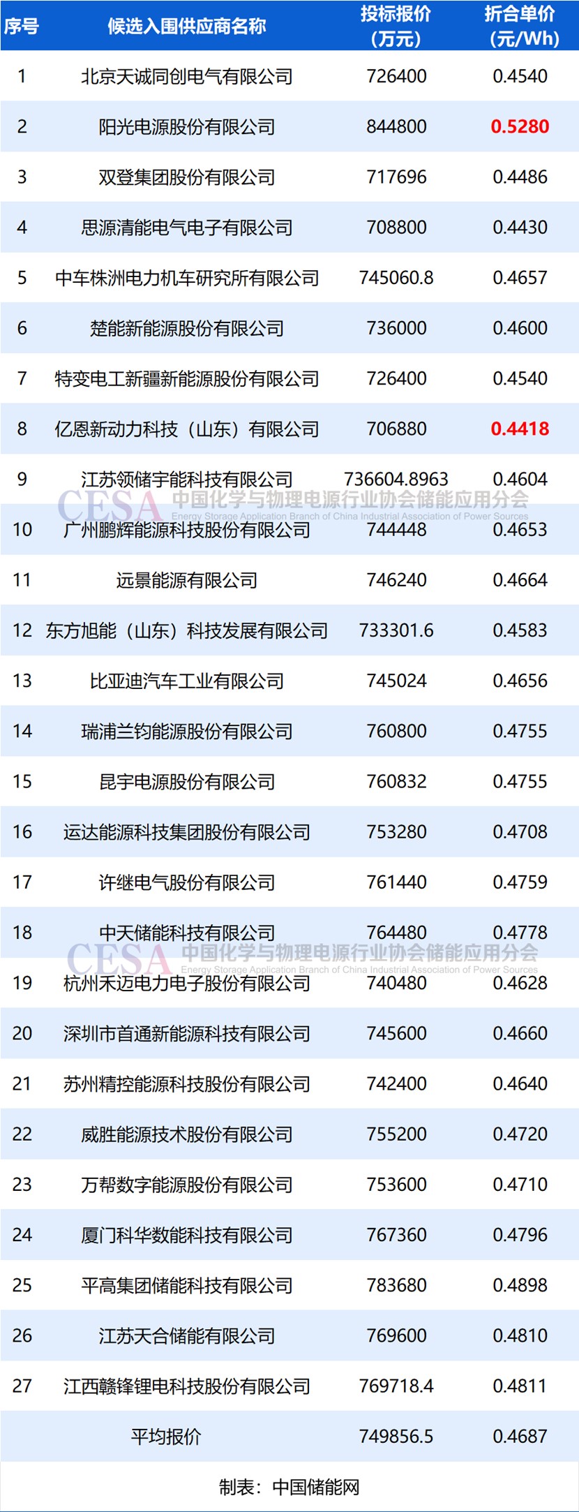 入圍的這27家企業(yè)投標報價范圍在0.4418-0.528元/Wh,平均單價0.4687元/Wh。最低報價來自于億恩新動力,其報價為70.688億元,折合單價0.4418元/Wh,最高報價來自于陽光電源84.48億元,折合單價0.528元/Wh,也是入圍企業(yè)中唯一超過0.5元/Wh的企業(yè)。