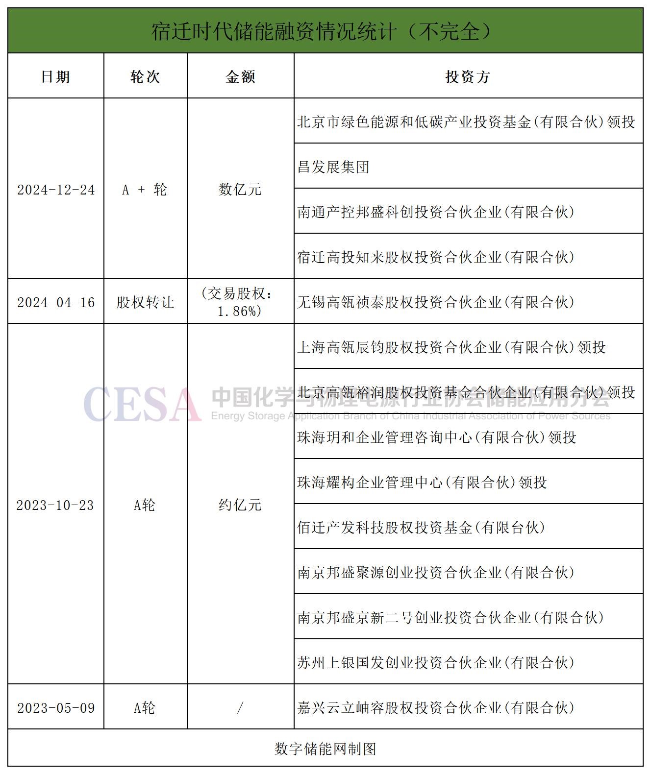 近日,宿遷時(shí)代儲(chǔ)能科技有限公司官宣完成數(shù)億元A+輪融資。由北京綠色能源基金領(lǐng)投,昌平能源智造基金、南京邦盛資本、北京知來(lái)投資跟投。