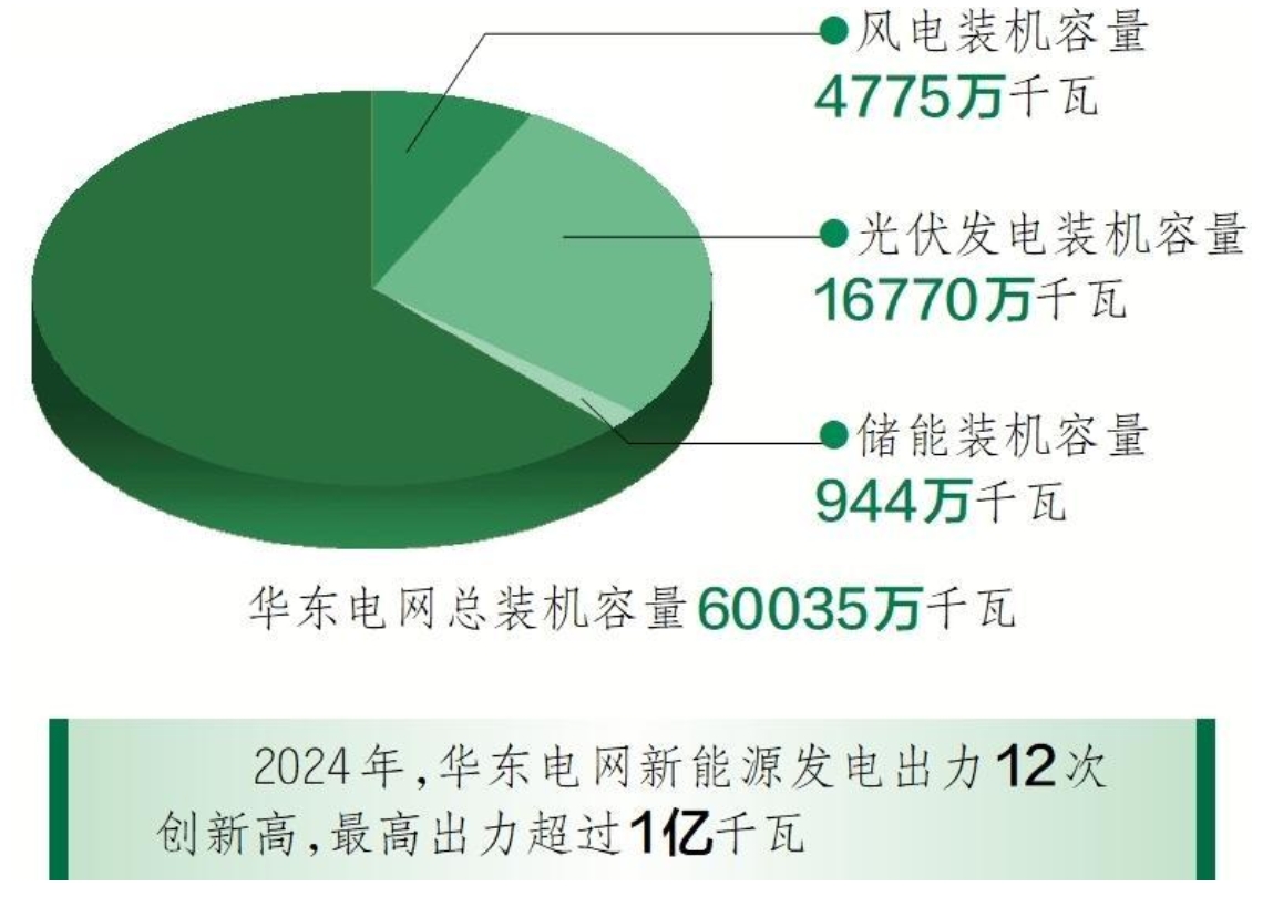近年來(lái),華東電網(wǎng)網(wǎng)內(nèi)電源結(jié)構(gòu)持續(xù)調(diào)整,燃煤、核電、抽水蓄能裝機(jī)容量持續(xù)增長(zhǎng),新能源電力快速發(fā)展,裝機(jī)規(guī)模不斷增長(zhǎng)。2024年,華東電網(wǎng)新能源發(fā)電出力12次創(chuàng)新高,最高出力超過(guò)1億千瓦。