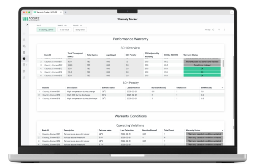 去年12月,ACCURE Battery Intelligence公司為其軟件平臺(tái)推出了一項(xiàng)新的預(yù)測(cè)分析功能——保修跟蹤器,該功能可以通過(guò)運(yùn)行數(shù)據(jù)持續(xù)監(jiān)控電池儲(chǔ)能系統(tǒng)。