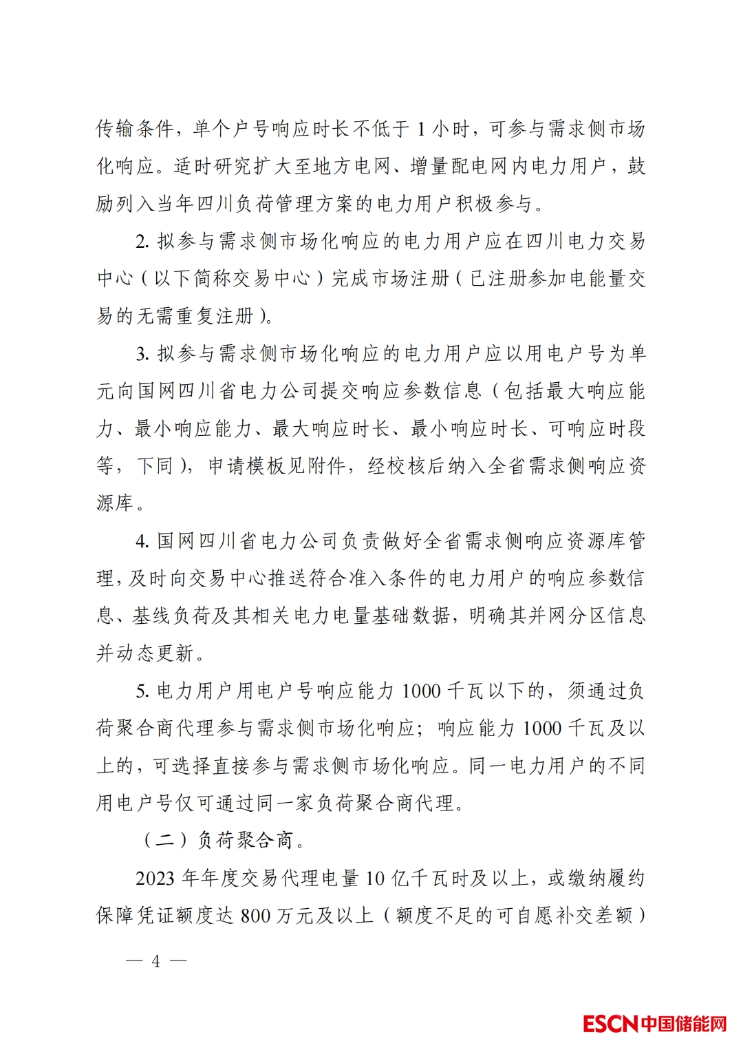 中國儲能網(wǎng)訊:4月19日,四川省經(jīng)濟和信息化廳等4部門印發(fā)了《2023年四川省電力需求側(cè)市場化響應(yīng)實施方案》。目的為了加快推進電力需求側(cè)管理,充分調(diào)動電力需求側(cè)靈活負荷資源,引導(dǎo)電力用戶根據(jù)電力系統(tǒng)需要削減高峰用電需求,主動錯峰避峰、主動調(diào)整生產(chǎn)或短時中斷生產(chǎn),進一步建立需求側(cè)市場化響應(yīng)機制,促進負荷高峰時段全省電力供需平衡,確保迎峰度夏和第31屆世界大學(xué)生夏季運動會電力供應(yīng)萬無一失。文件指出,2023年年度交易代理電量10億千瓦時及以上,或繳納履約保障憑證額度達800萬元及以上(額度不足的可自愿補交差額)的售電公司,可在電力交易平臺申請成為負荷聚合商,代理電力用戶參與需求側(cè)市場化響應(yīng)。