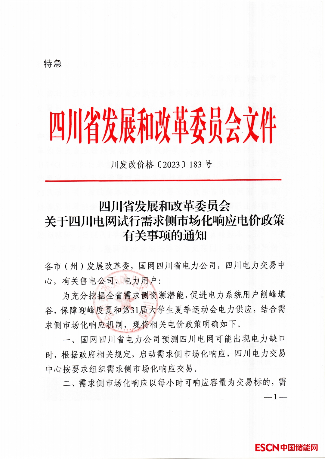 同日,四川省發(fā)展和改革委員會發(fā)布特急文件——《關(guān)于四川電網(wǎng)試行需求側(cè)市場化響應(yīng)電價政策有關(guān)事項的通知》,明確需求響應(yīng)價格的上下限暫定為3元/千瓦時和0元/千瓦時,后期可視市場運行情況調(diào)整。優(yōu)先將四川電網(wǎng)尖峰電價增收資金等作為市場主體需求側(cè)市場化響應(yīng)收益的資金來源。若資金不足則另行疏導(dǎo);若資金存在盈余則滾動納入次年資金來源規(guī)模。