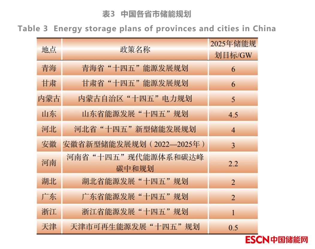 在儲能發(fā)展規(guī)劃層面,湖北、浙江、廣東、安徽、河北、內(nèi)蒙古等省市明確提出儲能規(guī)劃,如表3所示,到2025年新型儲能裝機共計39.7 GW。其中青海、甘肅儲能規(guī)模最大,2025年新型儲能預計裝機6 GW。