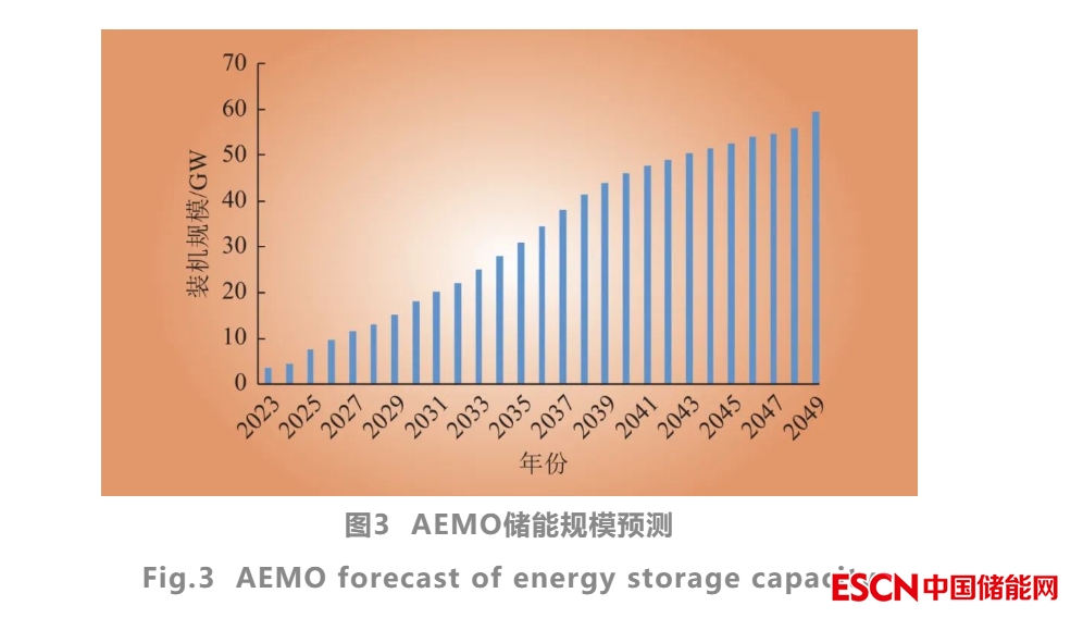 2021年12月,澳大利亞能源市場運營機構(AEMO)發(fā)布2022年綜合能源計劃(ISP2022),計劃到2049年儲能規(guī)模接近60 GW,預測規(guī)模如圖3所示[24]。其中,戶用型儲能(含光儲)占比70%,大型電池儲能占比20%,抽蓄等其他儲能占比10%。