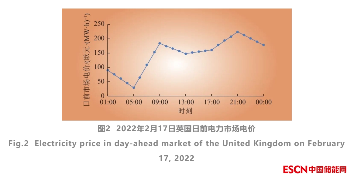 在峰谷套利方面,目前,英國日前市場的平均價差顯著提高,儲能價格不斷下降,獨立儲能或新能源配套儲能通過平衡單元等負荷聚合商參與日前市場和平衡市場,已基本具備盈利能力。2022年2月17日的英國日前市場電價如圖2所示,峰谷電價差達到200歐元/(MW·h),2 h和4 h儲能的平均峰谷套利價差為192歐元/(MW·h)、160歐元/(MW·h)左右。據(jù)測算分析,2、4 h儲能日均套利價差達到149歐元/(MW·h)(約合人民幣1.02元/(kW·h))、111歐元/(MW·h)(約合人民幣0.76元/(kW·h)),即可實現(xiàn)盈利(目標杠桿回報率為10%)。