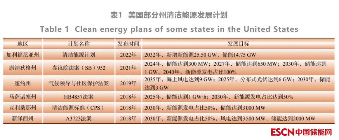 美國多個州制定了清潔能源發(fā)展計劃,明確了儲能發(fā)展目標,如表1所示。以加利福尼亞州為例,2022年2月,其公共事業(yè)委員會(CPUC)批準了一項長期清潔能源計劃,提出到2032年新增新能源25.50 GW、儲能14.75 GW。儲能新增規(guī)模達到新能源新增規(guī)模的58%[10]。同時,加利福尼亞州通過自上而下的采購指令,要求PG&E、SCE、SDG&E等公用事業(yè)公司部署電池儲能系統(tǒng),以推動儲能發(fā)展目標的實現(xiàn)。