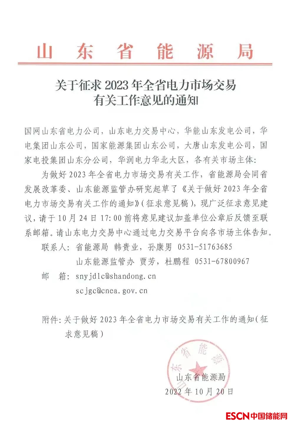 中國(guó)儲(chǔ)能網(wǎng)訊:10月20日,山東省能源局發(fā)布《關(guān)于征求2023年全省電力市場(chǎng)交易有關(guān)工作意見(jiàn)的通知》。
