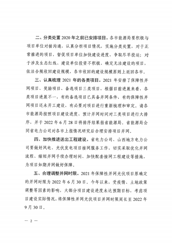 2021年保障性并網(wǎng)光伏項(xiàng)目原確定的并網(wǎng)時(shí)限為2022年6月30日。受疫情、土地政策 調(diào)整等因素的影響,將保障性并網(wǎng)光伏項(xiàng)目并網(wǎng)時(shí)限延長(zhǎng)至2022年 9月30日。