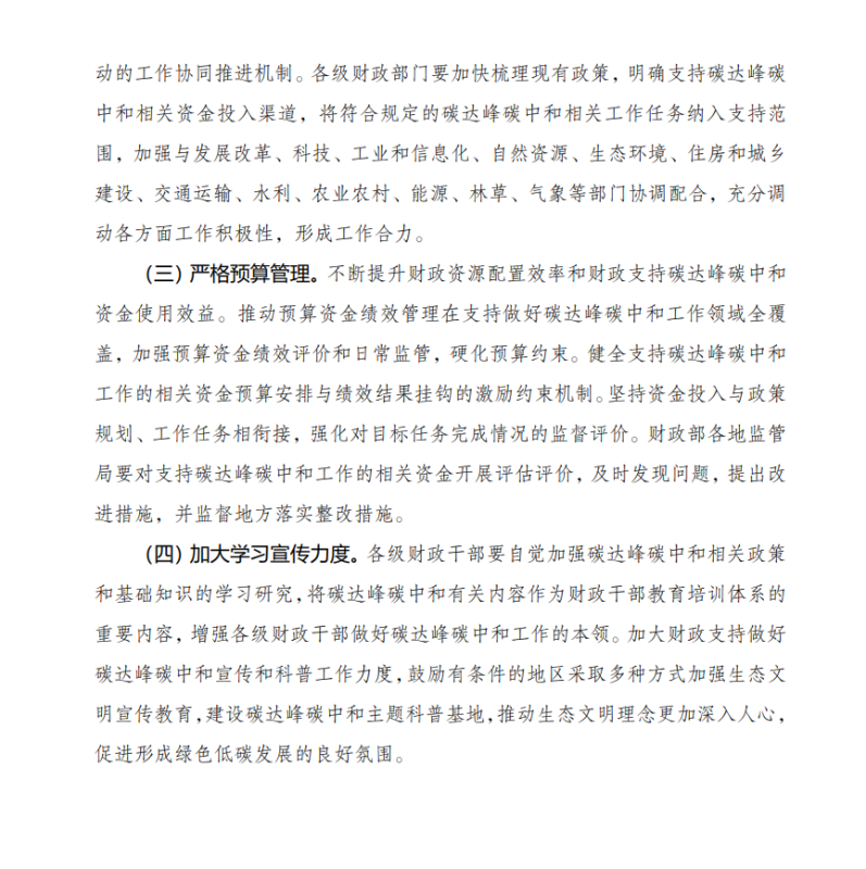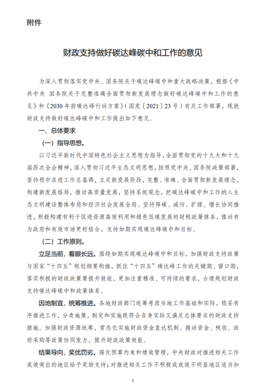 《意見(jiàn)》提到,立足當(dāng)前,著眼長(zhǎng)遠(yuǎn),圍繞如期實(shí)現(xiàn)碳達(dá)峰碳中和目標(biāo),加強(qiáng)財(cái)政支持政策與國(guó)家“十四五”規(guī)劃綱要銜接,抓住“十四五”碳達(dá)峰工作的關(guān)鍵期、窗口期,落實(shí)積極的財(cái)政政策要提升效能,更加注重精準(zhǔn)、可持續(xù)的要求,合理規(guī)劃財(cái)政支持碳達(dá)峰碳中和政策體系。政策框架體系的建立是財(cái)政支持碳達(dá)峰碳中和工作的基礎(chǔ),《意見(jiàn)》主要立足當(dāng)前發(fā)展階段,聚焦“十四五”時(shí)期政策體系框架初步建立目標(biāo),夯實(shí)我國(guó)碳達(dá)峰碳中和發(fā)展基礎(chǔ),同時(shí)著眼長(zhǎng)遠(yuǎn),合理規(guī)劃和完善財(cái)政支持碳達(dá)峰碳中和政策體系,為如期實(shí)現(xiàn)碳達(dá)峰碳中和目標(biāo)做好財(cái)政保障。