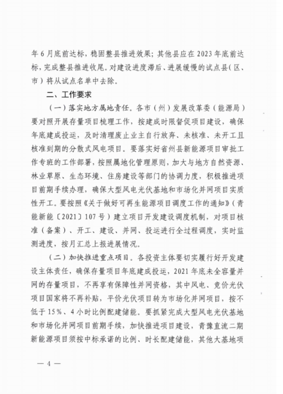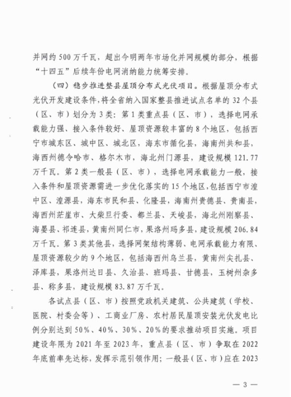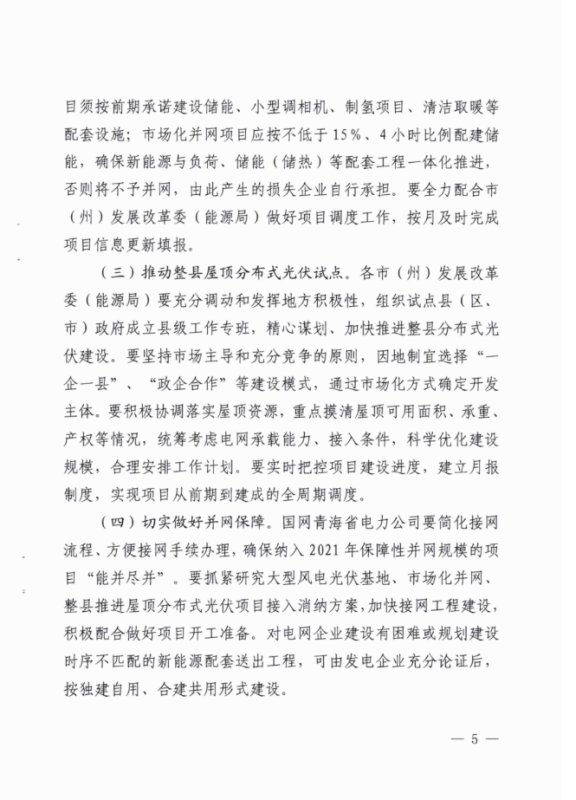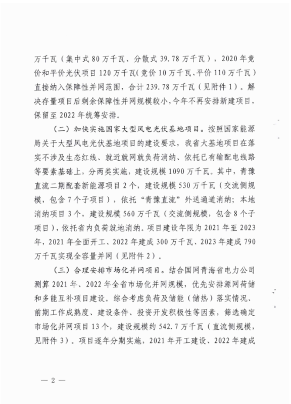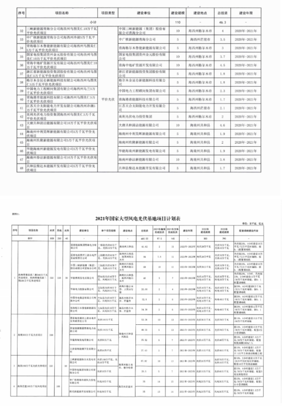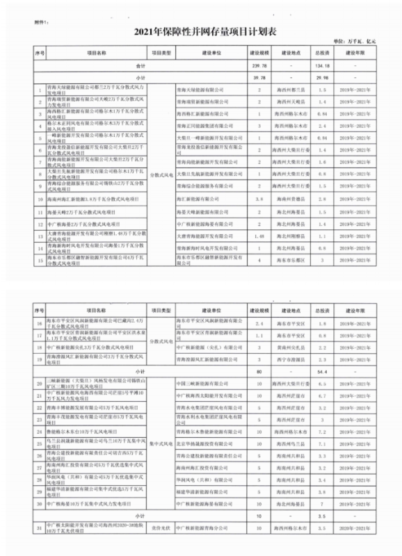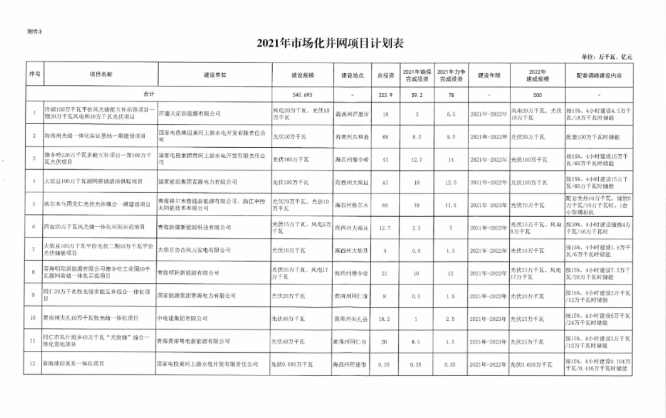 中國(guó)儲(chǔ)能網(wǎng)訊:根據(jù)近期獲悉的《2021年青海省新能源開發(fā)建設(shè)方案》,青海省2021年新能源建設(shè)計(jì)劃要求(1)優(yōu)先保障存量項(xiàng)目。2020年底前已核準(zhǔn)且在核準(zhǔn)有效期內(nèi)的風(fēng)電項(xiàng)目119.78萬(wàn)千瓦(集中式80萬(wàn)千瓦,分散式39.78萬(wàn)千瓦),光伏項(xiàng)目120萬(wàn)千瓦(競(jìng)價(jià)10萬(wàn)千瓦、平價(jià)11萬(wàn)千瓦)。解決存量項(xiàng)目后剩余保障性并網(wǎng)規(guī)模較小,2021年不安排新建項(xiàng)目,保留至2022年統(tǒng)籌安排。(2)加快實(shí)施國(guó)家大型風(fēng)電光伏基地項(xiàng)目。青海省大基地項(xiàng)目分兩類實(shí)施,建設(shè)規(guī)模1090萬(wàn)千瓦。其中,青豫直流二期配套新能源項(xiàng)目規(guī)模為530萬(wàn)千瓦(交流側(cè)規(guī)模,包含7個(gè)子項(xiàng)目);本地消納項(xiàng)目3個(gè),建設(shè)規(guī)模560萬(wàn)千瓦。依托省內(nèi)負(fù)荷就地消納,項(xiàng)目建設(shè)年限為2021-2023年,2021年全面開工、2022年建成300萬(wàn)千瓦、2023年建成790萬(wàn)千瓦實(shí)現(xiàn)全容量并網(wǎng)。(3)合理安排市場(chǎng)化并網(wǎng)項(xiàng)目。優(yōu)先安排源網(wǎng)荷儲(chǔ)和多能互補(bǔ)項(xiàng)目建設(shè),篩選確定市場(chǎng)化并網(wǎng)項(xiàng)目13個(gè),建設(shè)規(guī)模約542.7萬(wàn)千瓦。項(xiàng)目逐年分期實(shí)施,2021年開工建設(shè)、2022年建成并網(wǎng)約500萬(wàn)千瓦,超出2021-2022年市場(chǎng)化規(guī)模的項(xiàng)目,根據(jù)“十四五”后續(xù)年份電網(wǎng)消納能力統(tǒng)籌安排。(4)穩(wěn)步推進(jìn)整縣屋頂分布式光伏項(xiàng)目。根據(jù)文件,市場(chǎng)化并網(wǎng)項(xiàng)目要按照不低于15%、4小時(shí)比例配建儲(chǔ)能。對(duì)電網(wǎng)企業(yè)建設(shè)有困難或規(guī)劃建設(shè)時(shí)序不匹配的新能源配套送出工程,可由發(fā)電企業(yè)充分論證后,按獨(dú)建自用、合建共用形式建設(shè)。