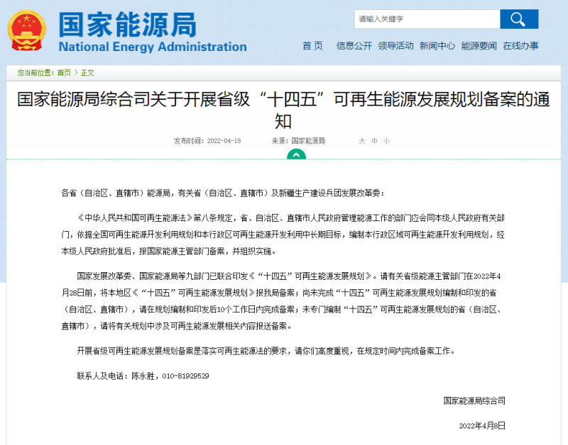 國(guó)家發(fā)展改革委、國(guó)家能源局等九部門已聯(lián)合印發(fā)《“十四五”可再生能源發(fā)展規(guī)劃》。請(qǐng)有關(guān)省級(jí)能源主管部門在2022年4月28日前,將本地區(qū)《“十四五”可再生能源發(fā)展規(guī)劃》報(bào)我局備案;尚未完成“十四五”可再生能源發(fā)展規(guī)劃編制和印發(fā)的?。ㄗ灾螀^(qū)、直轄市),請(qǐng)?jiān)谝?guī)劃編制和印發(fā)后10個(gè)工作日內(nèi)完成備案;未專門編制“十四五”可再生能源發(fā)展規(guī)劃的?。ㄗ灾螀^(qū)、直轄市),請(qǐng)將有關(guān)規(guī)劃中涉及可再生能源發(fā)展相關(guān)內(nèi)容報(bào)送備案。