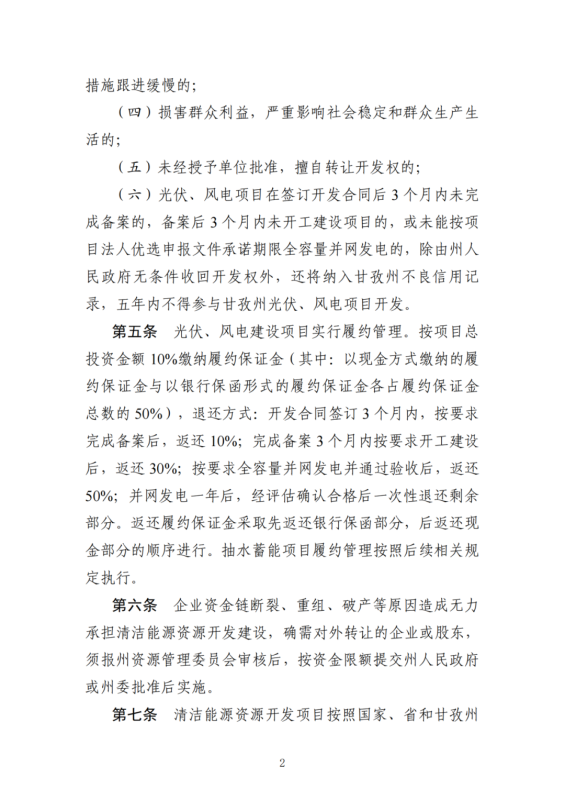 (六)光伏、風(fēng)電項(xiàng)目在簽訂開發(fā)合同后3個月內(nèi)未完成備案的,備案后3個月內(nèi)未開工建設(shè)項(xiàng)目的,或未能按項(xiàng)目法人優(yōu)選申報文件承諾期限全容量并網(wǎng)發(fā)電的,除由州人民政府無條件收回開發(fā)權(quán)外,還將納入甘孜州不良信用記錄,五年內(nèi)不得參與甘孜州光伏、風(fēng)電項(xiàng)目開發(fā)。