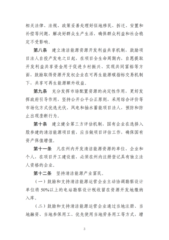 此外,堅持清潔能源產(chǎn)業(yè)富民。鼓勵和支持清潔能源運(yùn)營企業(yè)主動協(xié)調(diào)勘察設(shè)計單位將50%以上的電站勘察設(shè)計稅收留在資源開發(fā)地繳納入庫。