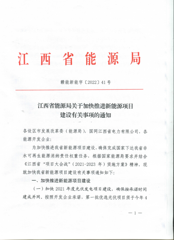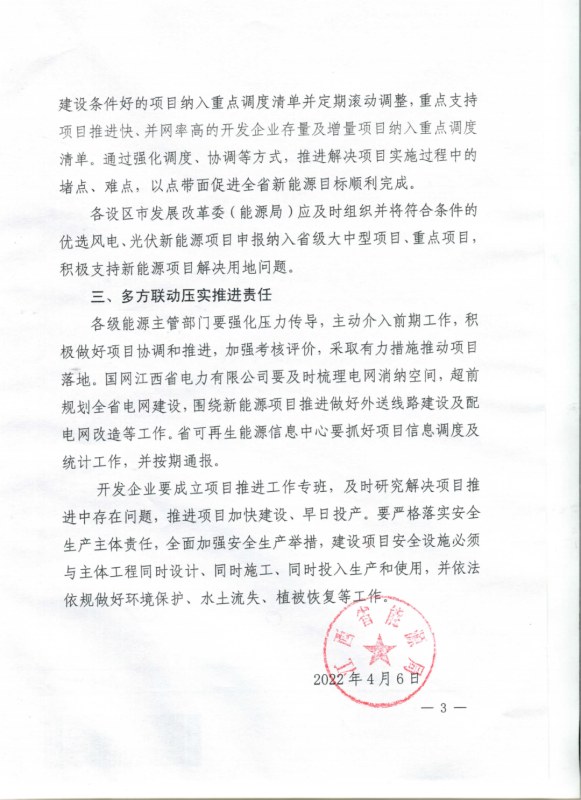 此外,將建立重點(diǎn)項(xiàng)目調(diào)度機(jī)制,選取一批單體規(guī)模大、建設(shè)條件好的項(xiàng)目納入重點(diǎn)調(diào)度清單并定期滾動(dòng)調(diào)整,將符合條件的優(yōu)選風(fēng)電、光伏新能源項(xiàng)目申報(bào)納入省級(jí)大中型項(xiàng)目、重點(diǎn)項(xiàng)目,積極支持新能源項(xiàng)目解決用地問題。國網(wǎng)江西省電力有限公司要及時(shí)梳理電網(wǎng)消納空間,超前規(guī)劃全省電網(wǎng)建設(shè),圍繞新能源項(xiàng)目推進(jìn)做好外送線路建設(shè)及配電網(wǎng)改造等工作。
