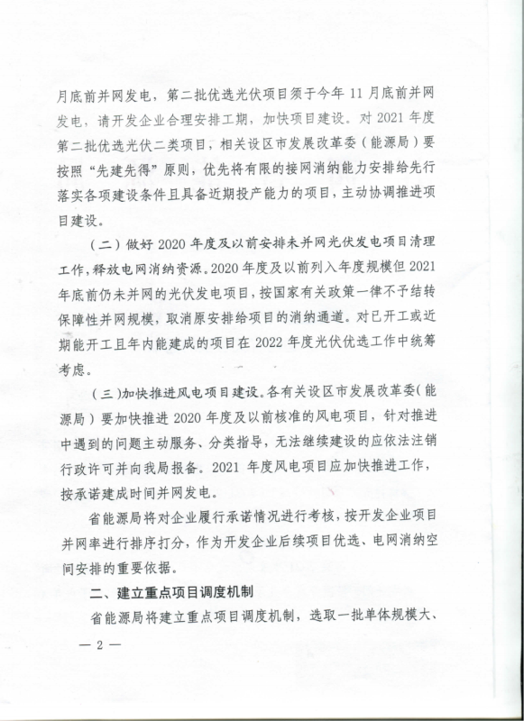 對2020年度及以前安排未并網(wǎng)光伏發(fā)電項(xiàng)目進(jìn)行清理,按國家有關(guān)政策一律不予結(jié)轉(zhuǎn)保障性并網(wǎng)規(guī)模,取消原安排給項(xiàng)目的消納通道,已開工或近期開工項(xiàng)目優(yōu)先納入2022年光伏優(yōu)選。省能源局將對企業(yè)履行承諾情況進(jìn)行考核,按開發(fā)企業(yè)項(xiàng)目并網(wǎng)率進(jìn)行排序打分,作為開發(fā)企業(yè)后續(xù)項(xiàng)目優(yōu)選、電網(wǎng)消納空間安排的重要依據(jù)。