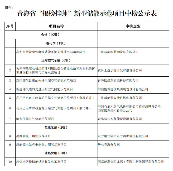 附件:青海省“揭榜掛帥”新型儲能示范項目中榜公示表