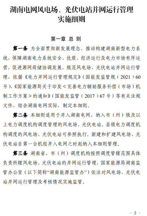 為全面貫徹新發(fā)展理念,推動(dòng)構(gòu)建湖南新型電力系統(tǒng),保障湖南電力系統(tǒng)安全、優(yōu)質(zhì)、經(jīng)濟(jì)運(yùn)行,促進(jìn)網(wǎng)源荷儲(chǔ)協(xié)調(diào)發(fā)展,規(guī)范風(fēng)電場(chǎng)、光伏電站并網(wǎng)運(yùn)行管理,依據(jù)《電力并網(wǎng)運(yùn)行管理規(guī)定》(國(guó)能發(fā)監(jiān)管規(guī)﹝2021﹞60號(hào))等有關(guān)法律法規(guī)和技術(shù)標(biāo)準(zhǔn),我辦組織制定了《湖南電網(wǎng)風(fēng)電場(chǎng)、光伏電站并網(wǎng)運(yùn)行管理實(shí)施細(xì)則》,現(xiàn)印發(fā)你們,請(qǐng)遵照?qǐng)?zhí)行。