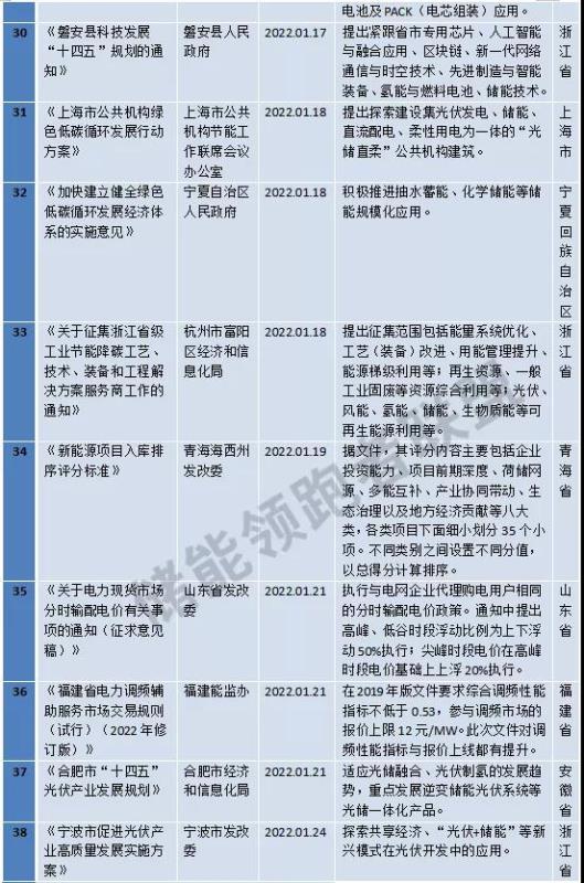 2022年1月4日,安徽省發(fā)改委發(fā)布《安徽省實(shí)施長(zhǎng)三角一體化發(fā)展規(guī)劃“十四五”行動(dòng)方案》,提出能源保供,積極爭(zhēng)取“外電入皖”,規(guī)劃建設(shè)長(zhǎng)三角皖北可再生能源生產(chǎn)基地和皖南綠色儲(chǔ)能基地,研究建立華東電網(wǎng)抽水蓄能共建共享機(jī)制,加強(qiáng)區(qū)域電力安全互濟(jì)互助。計(jì)劃開工阜陽(yáng)氫能高效智能綜合利用產(chǎn)業(yè)基地等重大項(xiàng)目,計(jì)劃制定推動(dòng)長(zhǎng)三角垃圾焚燒發(fā)電市場(chǎng)化運(yùn)營(yíng)實(shí)施方案,計(jì)劃出臺(tái)長(zhǎng)三角各省市加強(qiáng)應(yīng)急備用調(diào)峰電源能力建設(shè)實(shí)施方案和堅(jiān)強(qiáng)電網(wǎng)保障指導(dǎo)意見(jiàn)等。