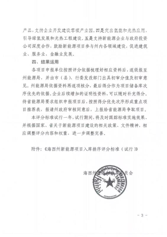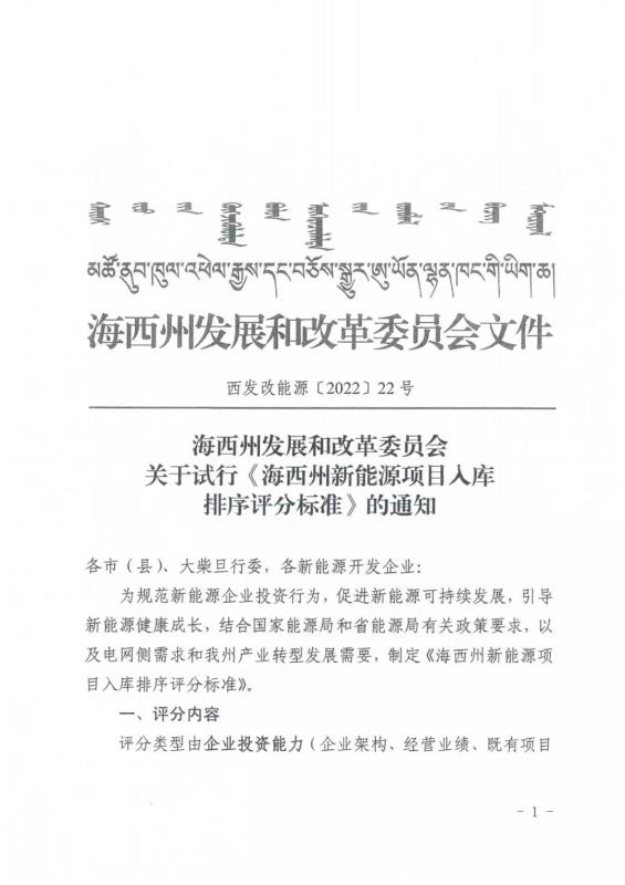 中國(guó)儲(chǔ)能網(wǎng)訊:1月19日,青海海西州發(fā)改委印發(fā)《新能源項(xiàng)目入庫(kù)排序評(píng)分標(biāo)準(zhǔn)》,通過(guò)八大類35小項(xiàng)的評(píng)分類型對(duì)新能源項(xiàng)目進(jìn)行評(píng)分排序。