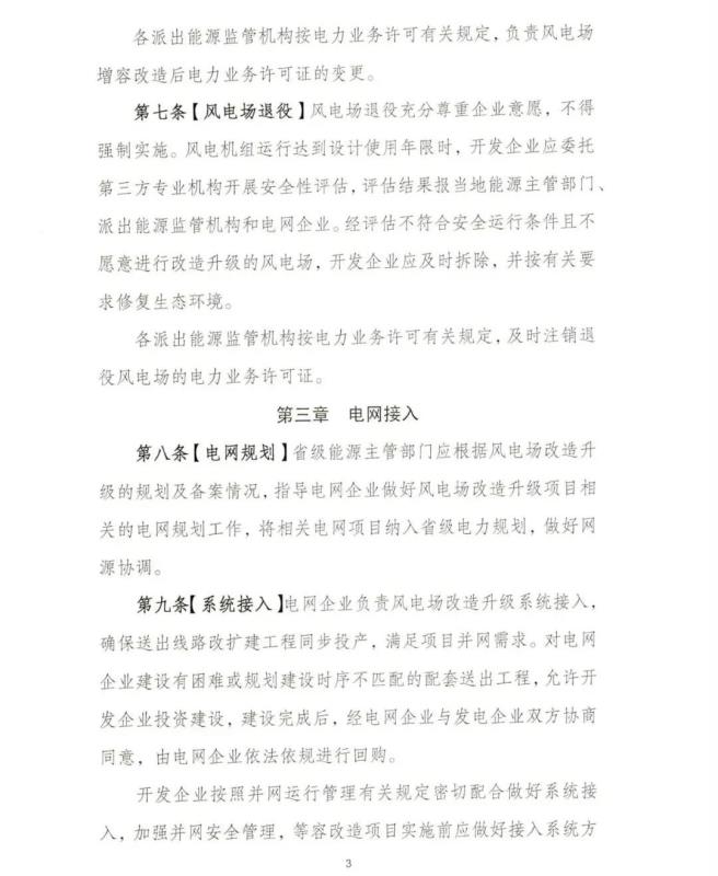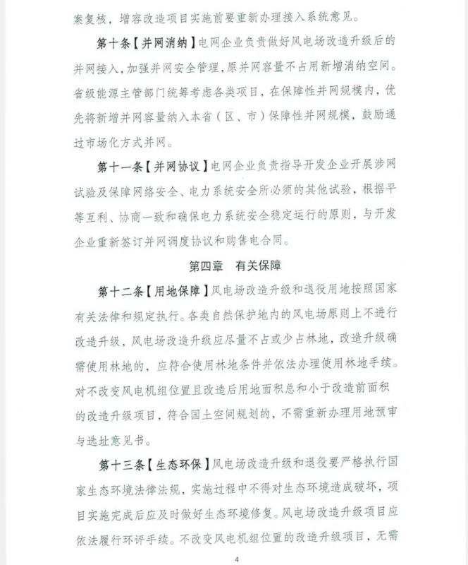 并網(wǎng)消納方面,電網(wǎng)企業(yè)負責做好風電場改造升級后的并網(wǎng)接入,加強并網(wǎng)安全管理,原并網(wǎng)容量不占用新增消納空間。省級能源主管部門統(tǒng)籌考慮各類項目,在保障性并網(wǎng)規(guī)模內(nèi),優(yōu)先將新增并網(wǎng)容量納入本?。▍^(qū)、市)保障性并網(wǎng)規(guī)模,鼓勵通過市場化方式并網(wǎng)。
