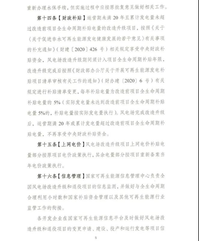 財政補貼方面,運營期未滿20年且累計發(fā)電量未超過改造前項目全生命周期補貼電量的改造升級項目,按照《關于〈關于促進非水可再生能源發(fā)電健康發(fā)展的若干意見〉有關事項的補充通知》(財建〔2020〕426號)相關規(guī)定享受中央財政補貼資金,風電場改造升級期間須計入項目全生命周期補貼年限,改造升級完成后按照《財政部辦公廳關于開展可再生能源發(fā)電補貼項目清單審核有關工作的通知》(財辦建〔2020〕6號)有關規(guī)定進行補貼清單變更,每年補貼電量為改造前項目全生命周期補貼電量的5%(實際發(fā)電量未達到改造前項目全生命周期補貼電量5%的,補貼電量按實際發(fā)電量執(zhí)行)。風電場完成改造升級后,運營期滿20年或累計發(fā)電量超過改造前項目全生命周期補貼電量,不再享受中央財政補貼資金。