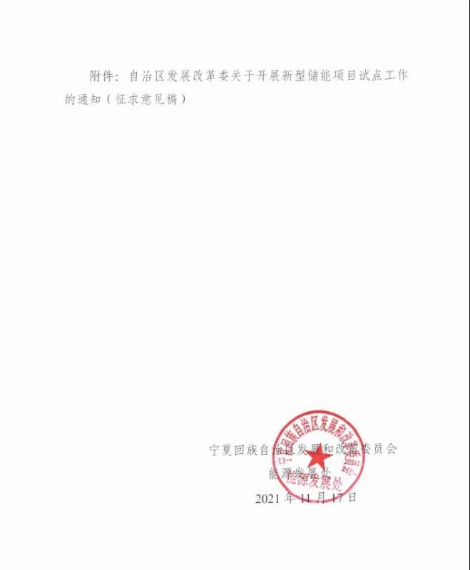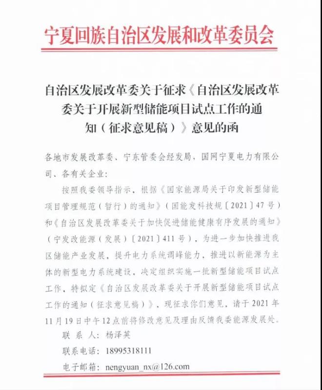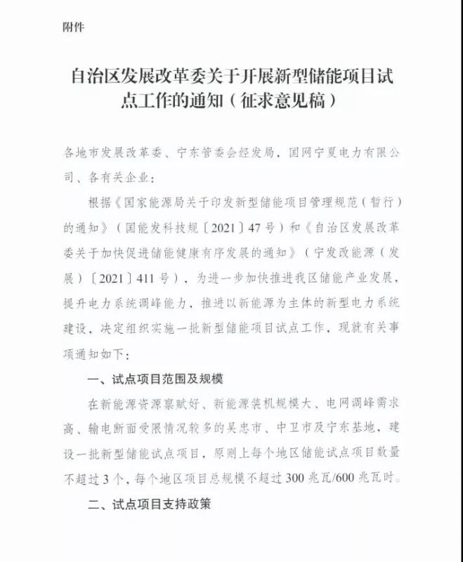 中國(guó)儲(chǔ)能網(wǎng)訊:11月17日,寧夏回族自治區(qū)發(fā)展和改革委員會(huì)發(fā)布關(guān)于開(kāi)展新型儲(chǔ)能項(xiàng)目試點(diǎn)工作的通知(征求意見(jiàn)稿),根據(jù)意見(jiàn)稿,在新能源資源稟賦好、新能源裝機(jī)規(guī)模大、電網(wǎng)調(diào)峰需求高、輸電斷面受限情況較多的吳忠市、中衛(wèi)市及寧東基地,建設(shè)一批新型儲(chǔ)能試點(diǎn)項(xiàng)目,原則上每個(gè)地區(qū)儲(chǔ)能試點(diǎn)項(xiàng)目數(shù)量不超過(guò)3個(gè),每個(gè)地區(qū)項(xiàng)目總規(guī)模不超過(guò)300兆瓦/600兆瓦時(shí)。