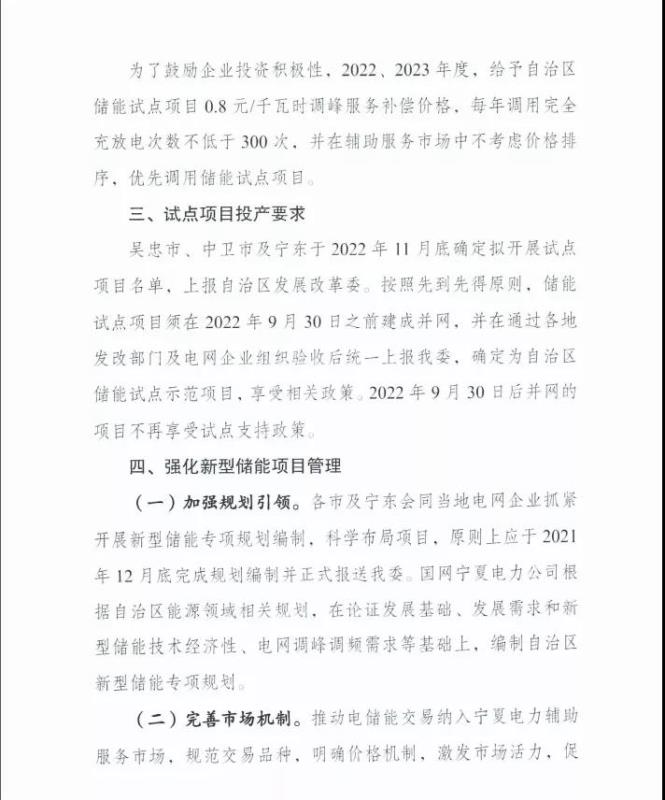 試點(diǎn)項(xiàng)目投產(chǎn)要求:吳忠市、中衛(wèi)市及寧東于2022年11月底確定擬開(kāi)展試點(diǎn)項(xiàng)目名單,上報(bào)自治區(qū)發(fā)展改革委。按照先到先得原則,儲(chǔ)能試點(diǎn)項(xiàng)目須在2022年9月30日之前建成并網(wǎng),并在通過(guò)各地發(fā)改部門(mén)及電網(wǎng)企業(yè)組織驗(yàn)收后同意上報(bào)我委,確定為自治區(qū)儲(chǔ)能試點(diǎn)示范項(xiàng)目,享受相關(guān)政策。2022年9月30日后并網(wǎng)的項(xiàng)目不再享受試點(diǎn)支持政策。